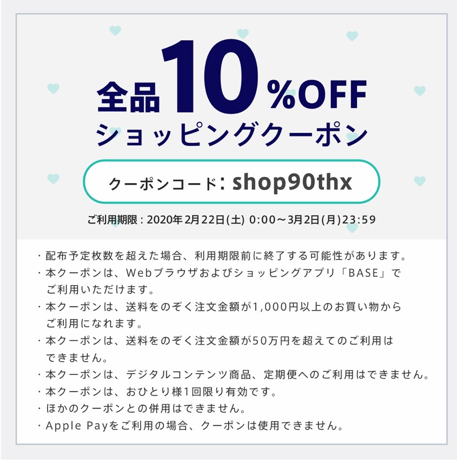 商品購入画面でクーポンコード≪ shop90thx ≫を入力して下さい。